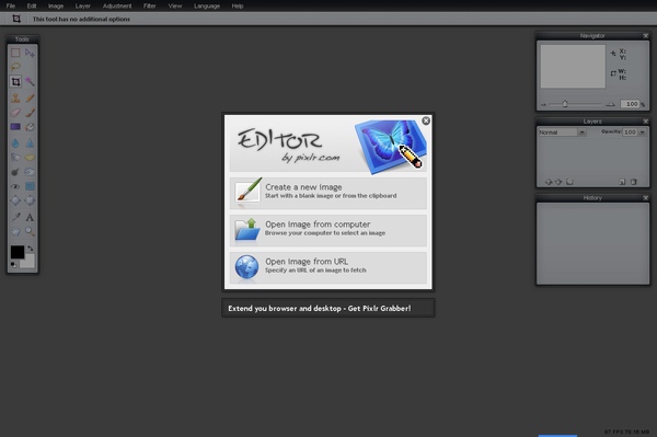 進入編輯介面,會詢問使用者開一個新檔案、從電腦開啟舊檔或是網址開啟線上圖檔。