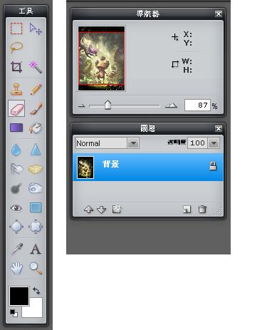 開啟圖檔後,可以發現選取工具、套索、魔術棒,畫筆、油漆桶、圖章,到模糊、清晰、海綿、塗抹、去紅眼、橡皮擦…等各種工具一應俱全,畫面右邊還有導航器跟圖層視窗,非常地方便。