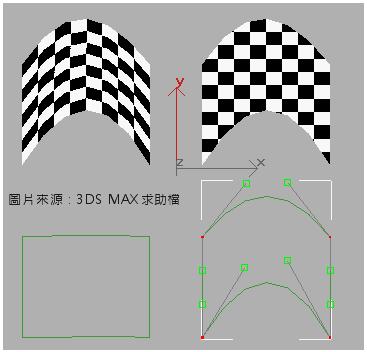 MAX從R3 版起有一個修改工具很像NURBS,就是可以使用一般的Spline線條繪出物件的輪廓(如上圖),然後使用 Line 及鎖點,把各個輪廓的點接起來,注意點和點之間要重疊。而輪廓的曲線幅度則是透過Spline 點的貝茲控點調整。最後加入Surface 修改就可產生面。