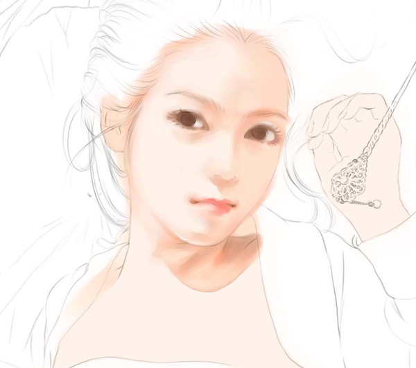 同時把唇色塗一層淺淺的粉紅色,且用比陰影色再重一點點的膚色,把人物的頭髮與臉頰接觸處、下巴及剛剛塗過顏色的脖子陰影處,均勻的把顏色塗抹過。