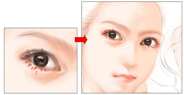 選擇膚色的底色,把眼頭的位置畫白加強立體感(如圖示中標示1處);接著把眼睫毛一一的畫上,畫完後可再用咖啡色修飾上眼皮;用比膚色紅一點點的顏色如H:36%~35%修飾眼頭內的眼肉及眼尾(如圖示中標示2處)用淺一點的顏色修飾下眼瞼(如圖示中標示3處),再用咖啡色輕輕的擦拭及修整下眼線及眼尾的地方(如圖示中標示4處)。