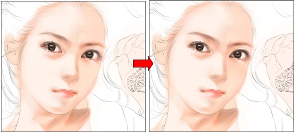 將圖片中人物的陰影膚色,再塗抹均勻及修正,可按鍵盤的Alt(吸色滴管的快捷鍵),單擊圖中膚色原本畫陰影的深膚色,然後再把不均勻的膚色抹勻一下,並用灰黑色淡淡的抹一下二隻眼睛的上眼皮,使原本畫的比較銳利的上眼皮再柔和一點。