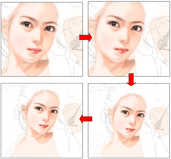 最後用膚色的陰影色,把脖子及下巴處抹勻並修飾出下巴,且在下巴的陵線上,畫一條比底色再淺一些的顏色,用以加強臉頰的立體感(下巴的陵線,即是下巴與脖子的交接處;陵線指的是面與面的交接處);用白色把臉的周圍擦乾淨,擦出臉型,接著把耳朵的立體感也畫出來。