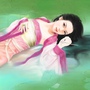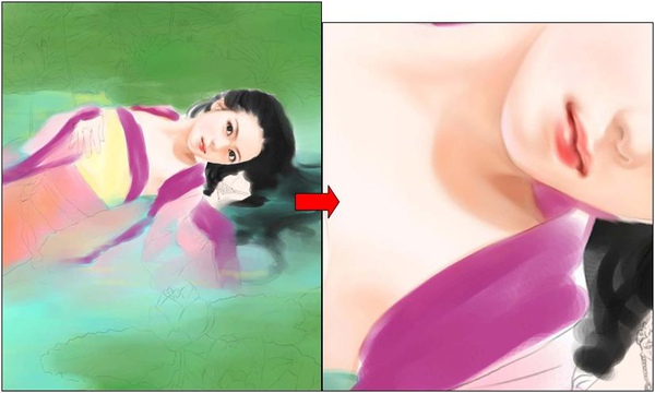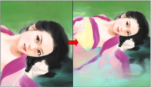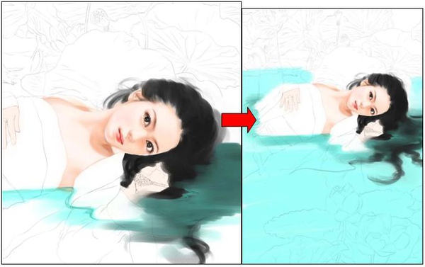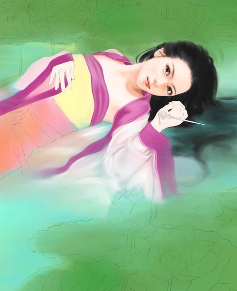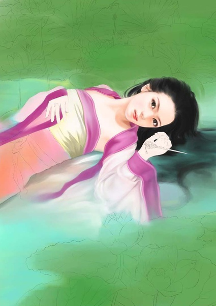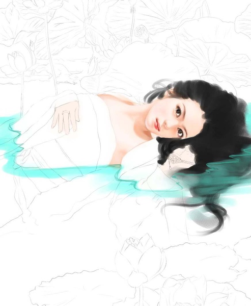 使用“數位水彩-簡單水筆”畫上衣服及背景的底色,把衣服的衣襟上的立體感用淺色畫出光澤,用比衣服底色重的顏色畫出陰影以營造出立體感;用黑色把頭髮的位置繪製均勻,並用水的藍綠色去塗抹頭髮泡在水裡的地方。
