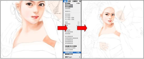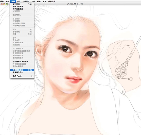 在畫完人物的五官後,接著選擇“圖層>弄乾數位水彩”把數位水彩變乾