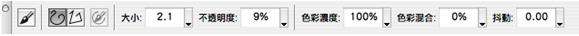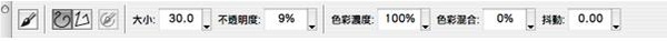 在工具狀態列上,混色筆的色彩濃度設定為0%,所以不會畫出顏色,因此只有塗抹顏色的功能而已;由深的顏色往淺色推塗,可以把深色推塗過去,反之就是淺的顏色推塗過去;不透明度的數值愈大,混色效果愈明顯,反之就會愈輕柔;通常顏色要均勻且柔和,不透明度會設定在22%左右,需混合明顯一點就會在25%~40%之間。