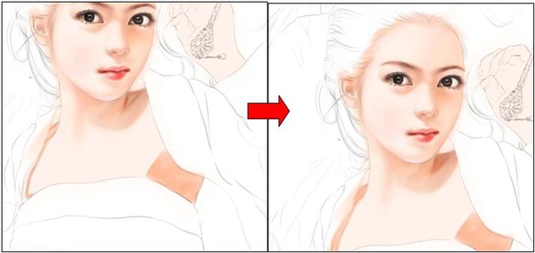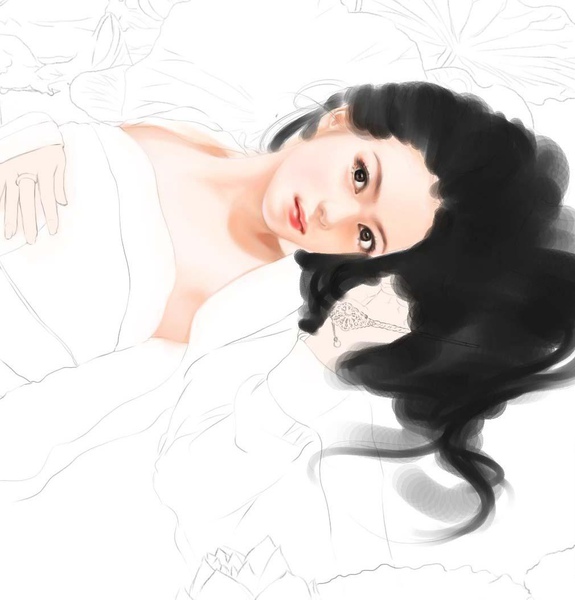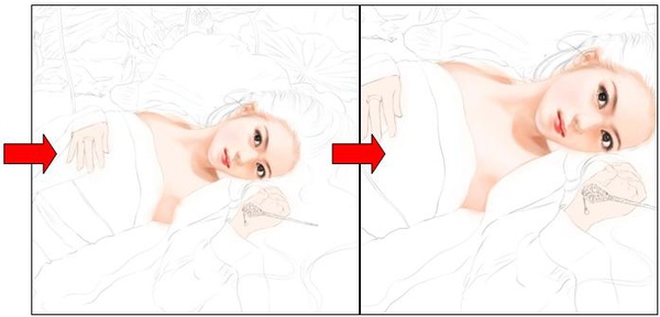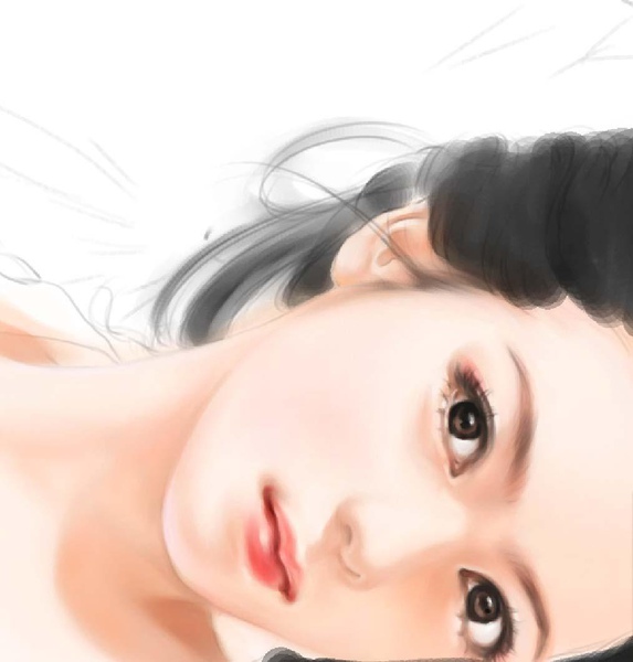 (數位水彩的特性,只會針對還沒有變乾的數位水彩有影響,所以在已變乾修整後的膚色上,上一層頭髮色,可用白色的數位水彩來修飾都不會影響到已變乾的膚色哦!)