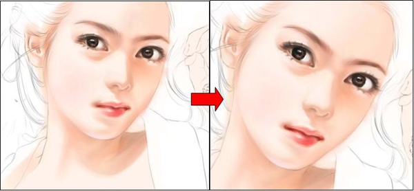 若要把膚色推塗均勻,就要順著人物臉上的肌肉紋理方向來推塗,如圖示,可以多抹幾次直到膚色均勻