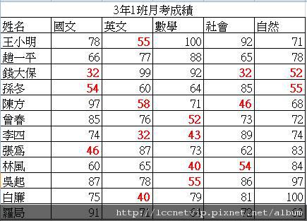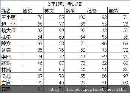 以下表常見的工作表:某小學3年1班的考試成績,類似的格式有很多不同的應用,例如某公司業務人員不同產品的銷售額等OOXX。