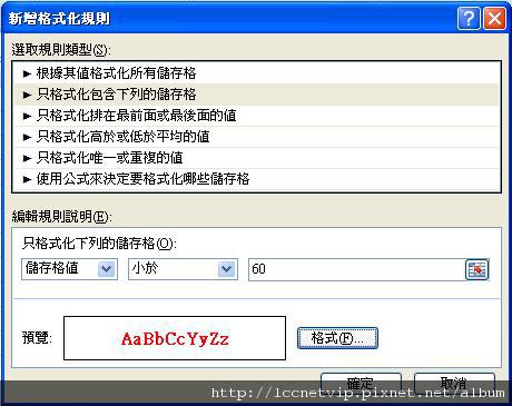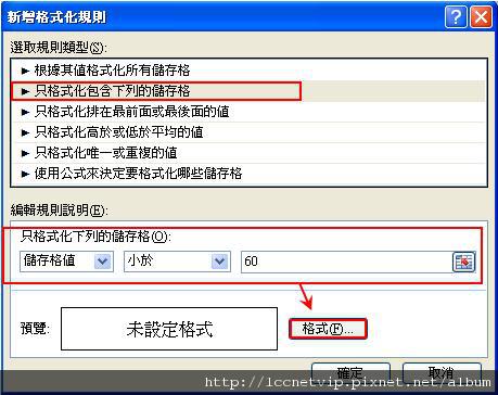 選取規則類型為「只格式化包含下列的儲存格」,因為要找出不及格的成績,因此編輯規則選擇「儲存格值」「小於」「60」,完成後點選格式。