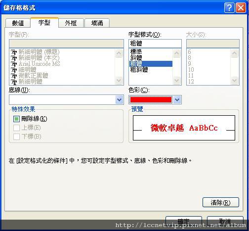 此時會出現儲存格格式功能選單,設定規則化儲存格顯示的格式,本文中設定為紅色的粗體字,設定完成後記得按「確定」。
