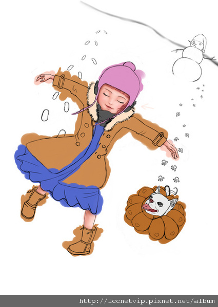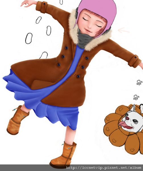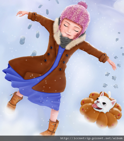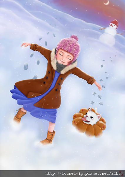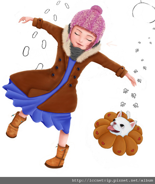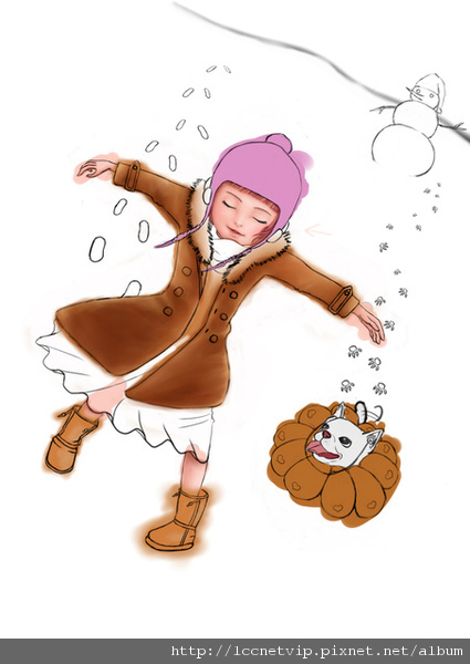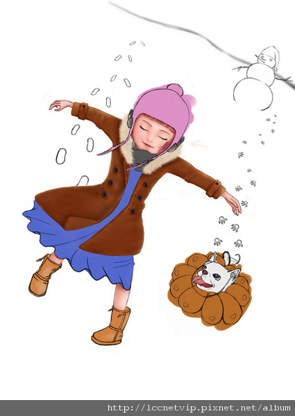 11.緊接著將背景粗略畫出,畫上雪花紛飛的模樣,及地上的積雪的厚實感。還有畫出女孩在冬天呼吸時應有的霧氣。在畫的過程中,我修改了連身裙搖擺飄動的方式,讓它更接近真實律動