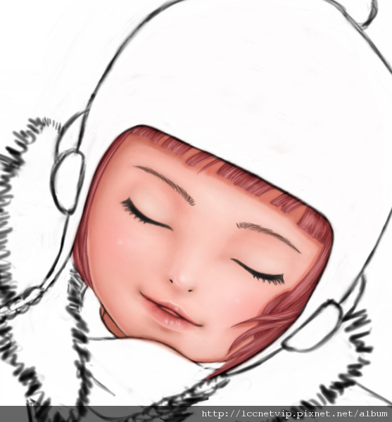 3.接著細刻人物的臉部,並將頭髮畫出,這時我順勢修改了一下草稿的樣子。