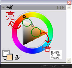 2. 接著才開始在兩頰、鼻頭跟額頭等比較亮的地方加上顏色較淡的膚色,相對的在光照不到的地方也用較深的膚色畫上影子。 (※在用色上建議用滴管工具吸取剛剛用來打底的膚色,然後上下移動,以打底的膚色為基準,向上即是用來畫亮面的膚色,向下的就拿來畫陰影,但是要注意顏色盡量不要混到灰色,因為那很容易讓畫面變髒,但是彩度也不能太高,那會很刺眼,儘量將顏色控制在三角型的中央。)