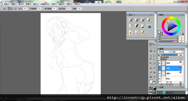 當然一開始大約畫一下就好了,這只是草稿而已嘛。如果有甚麼想改的通常都在這一步就先改了,我把長髮改成短髮,再加個像耳機的東西, 順便把眼鏡拿掉。接下來就認真的把線畫好。