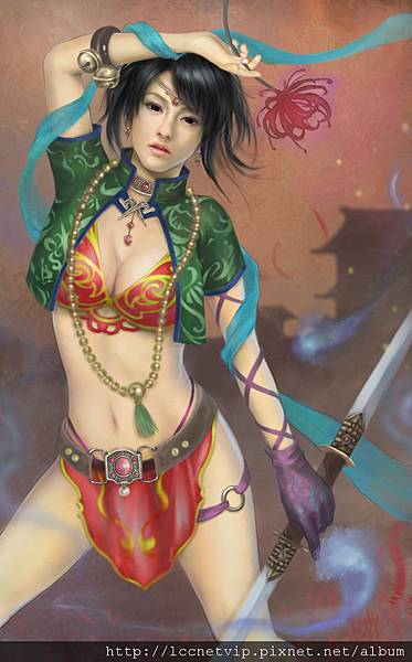 近期的代表作「幻想暴走」(上圖)就是累積了一段期間創作能量爆發後的作品,持鞭的女性獨特的服裝及造型精緻的飾品,在荊棘和樹影之間,火光閃爍,彷彿一場戰鬥即將開始的瞬間。