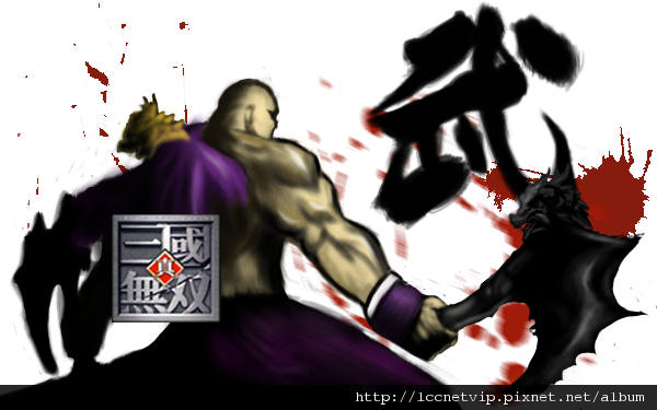 一方面閒暇之餘,我也利用時間幫喜愛的網路遊戲魔獸爭霸-真三國無雙7版(由Falcon & Gyd設計的地圖) 製作Loading 圖,雖然沒有被採用,但是完成作品的時候真的很開心。這時的我,透過練任老師在課堂上傳授的訓練,已經懂得找尋適合的骨架圖,來做為臨摹的參考圖進一部描繪出自己的作品了。(下圖為真三國無雙-典韋)