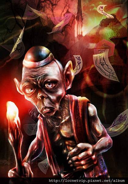 加上鬍鬚和上衣小短掛,上面的文字紋路如同上步驟般處理。在拐杖頭用發光比作出光芒效果,並依照此光源的投射處理臉部及身體的明暗。在最上層新增一圖層並設定為「重疊」,在此圖層上以噴槍添加其他冷色系環境光,這樣整體感才不會顯得單調。
