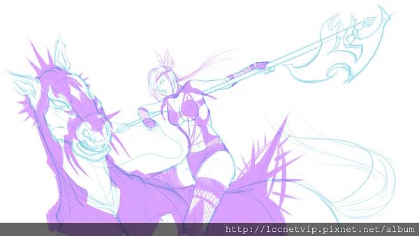 由於要表現出高傲的感覺,所以設定為仰角的鏡頭,這樣畫面呈現起來比較有居高臨下的感覺。太過於正面的構圖會被馬頭擋住,正側面又會太死板,所以就選了這個角度囉。(有點像是算數,一步一步的求出解答^^")