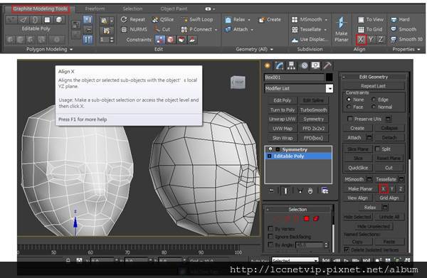 使用筆刷調整過的模型經常會動到中間的對稱線,此時再用Make Planer將它x軸對齊並將x座標歸零即可,用Edit poly裡的或Graphite modeling tools裡的都可以(圖10)。