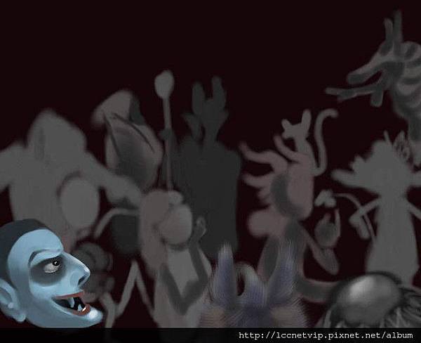 先將畫布底色大略定一個暗色調,然後另開一個新圖層把預設的各式怪物做概略的位置安排,至於怪物造型結構可以邊畫邊想或者參考知名圖片再做改變!
