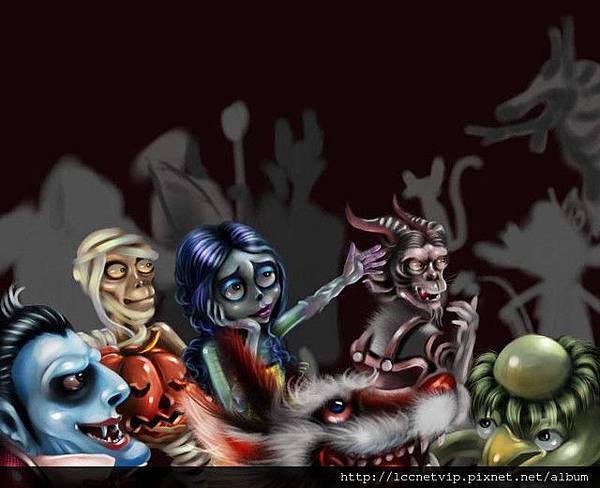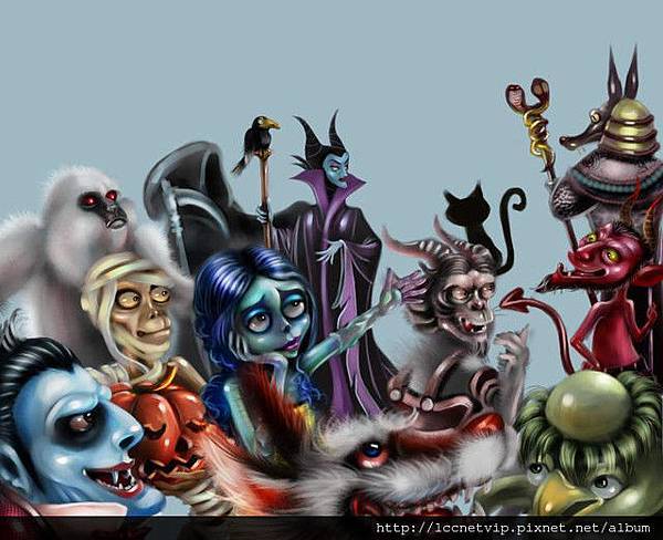 依照人物的出現順序逐漸添加各類造型的妖魔鬼怪,隨時要留意各角色身上的光影關係,處理光影的方式很多,可以使用最常利用的「燃燒」和「閃躲」來做基本處理,也可以另開圖層以「陰影對應」方式添加有透明度的陰影,最後依照整體感覺更改底色色調!