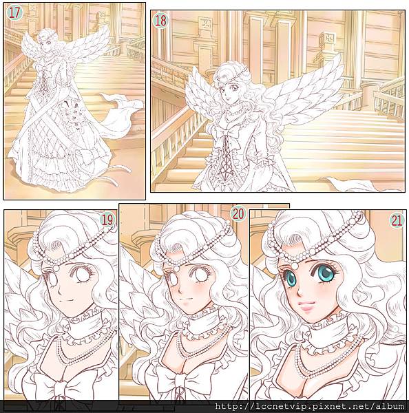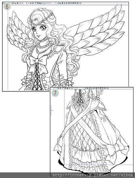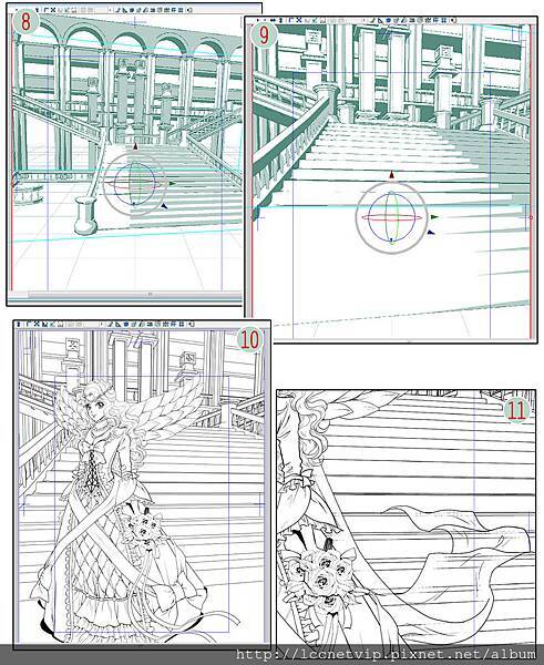 ◎人物的線稿完成後,接著是背景的部分,運用comic studio中的3DLT素材,選擇一個有如皇宮般華麗壯觀的素材,並編輯調整出一個能和人物視角和透視感搭配得宜的場景。