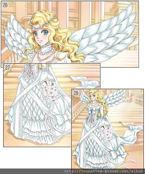 ◎在人物後方靠近階梯的位置,設計一片垂落的披風,營造飄逸夢幻的感覺。
