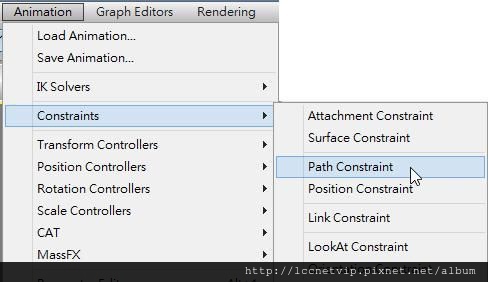 7.選取砲彈,在主工具列中,點擊【Animation】→【Constraints】→【Path Constraint】。