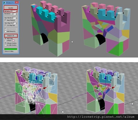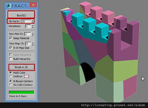 3. 點擊【Pick Object】按鈕,選取城牆,設定碎裂的塊數為20,按【start creating parts】按鈕。