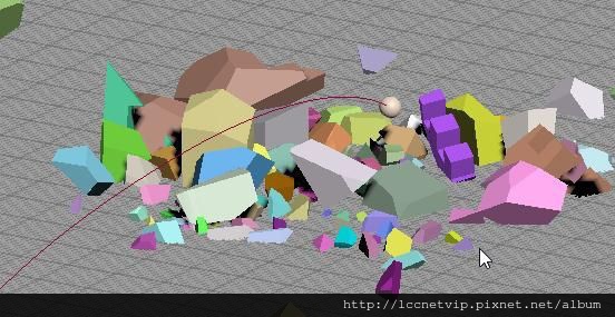 17.點擊【MassFXToolbar】工具列的播放鍵,模擬砲彈撞擊城牆的變化,會發現砲彈撞擊城牆後不會自然掉落到地面,如箭頭所示。若欲解決問題,只需將所有物件輸出即可。