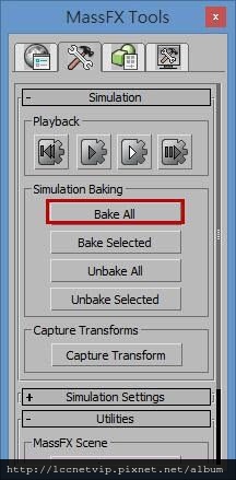 】按鈕,會出現設定視窗,點擊第二個頁籤,在【Simulation Baking】中,點選【Bake All】,即可將所有物件輸出為影格。