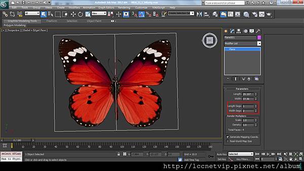 首先要做一隻能飛舞的蝴蝶。在3DS MAX中,座標[0,0,0]的位置創建一個Plane將貼圖貼上,利用Skin修改器和骨架做出蝴蝶揮動翅膀的動畫。