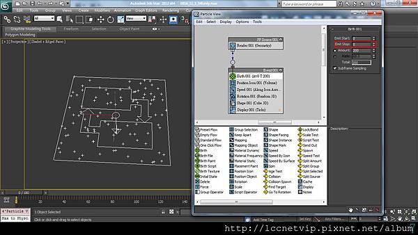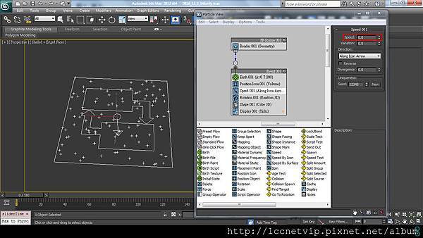 接著製作粒子碰撞效果。創建一個PF Source,在Particle View裡將Birth 001捲展欄的Emit Stop改為0,使粒子在一開始就全部出現在畫面當中。Speed 001捲展欄的Speed也改為0,拖動時間滑塊,可以發現粒子停留在PF Source 001上。