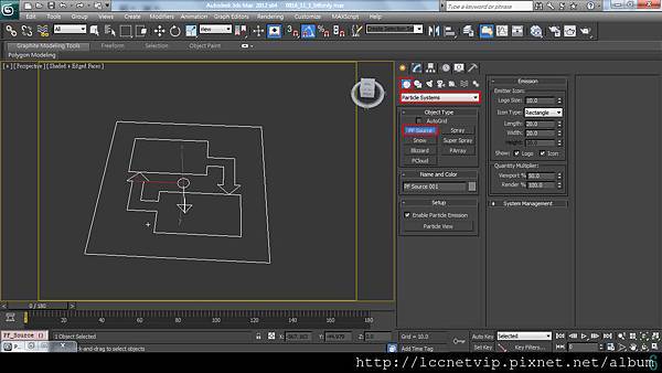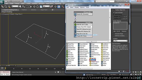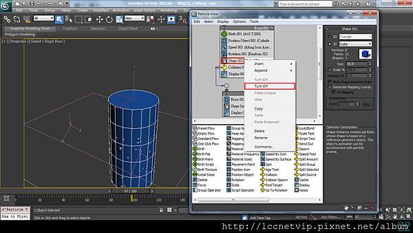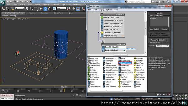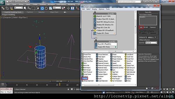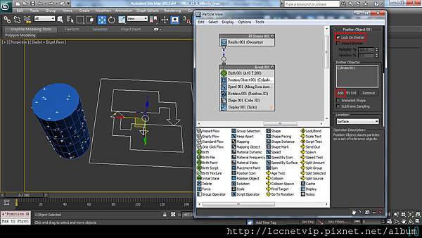 用Position Object結點替換掉原本的Position Icon 001。並創建一個圓柱,在Position Object 001的捲展欄中,將圓柱加入Emitter Objects,此時原先停留在PF Source 001上的粒子,全都轉移到圓柱的表面上了,但是移動圓柱時,粒子並沒有跟隨著圓柱移動,因此必須勾選Lock On Emitter。