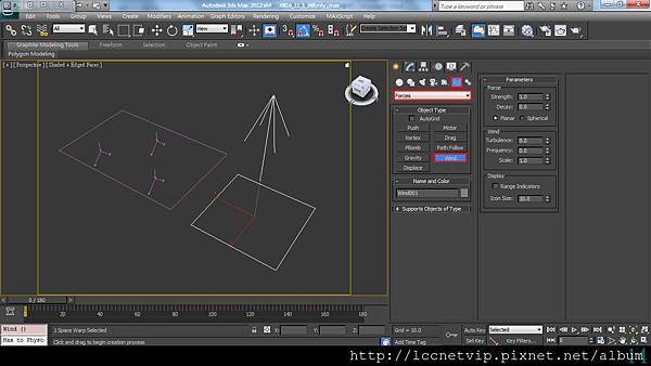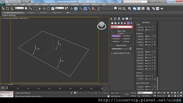 此時做個小動畫用圓柱撞擊PomniFlect001,粒子仍停留在圓柱表面上,並沒有受到影響。因此必須添加一個Force連接給Collision,創建一個Wind,在Force 001的捲展欄中,將Wind001加入Force Space Wraps。此時可以看到,粒子在碰撞PomniFlect001之後,就脫離圓柱往上飄了。