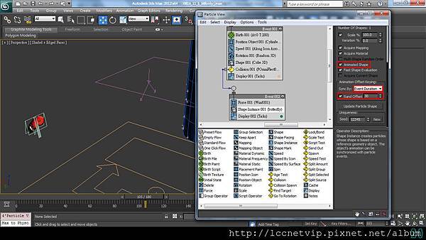 重頭戲來了。從目前渲染出的圖可以發現, 在與PomniFlect001碰撞之前和碰撞之後,粒子的顏色是不同的。這意味著碰撞前後兩個狀態可以有不同的外型表現。在Force和Display中間添加Shape Instance,在Shape Instance 001的捲展欄,拾取蝴蝶做為Particle Geometry Object,此時凡是碰撞過PomniFlect001的粒子都會變身成蝴蝶的外型。勾選Animated Shape使粒子不只是得到蝴蝶的外型也得到蝴蝶所有的動畫。Animation Offset Keying選擇Event Duration,再勾選Rand Offset,每個粒子就能隨機的開始飛舞的動畫,使畫面變得更豐富更有層次。