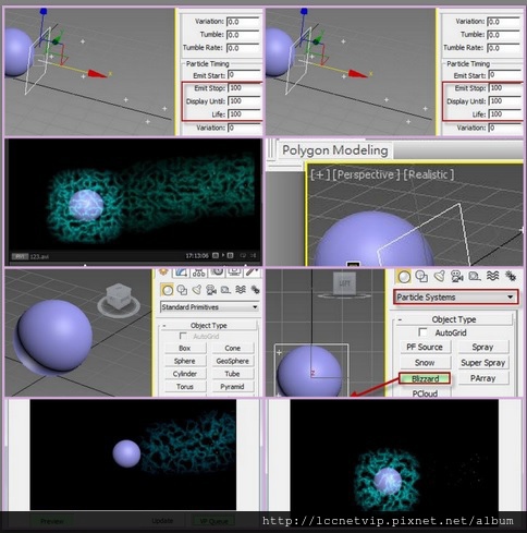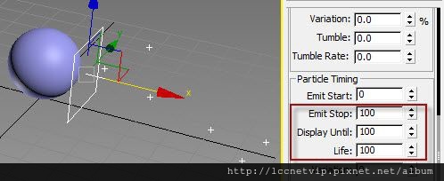 3將粒子系統移動到球體的後方,再到修改面板修改數值,Life是生命週期,DisplayUntil是粒子顯示到何時, Emit Stop是發射結束時間。