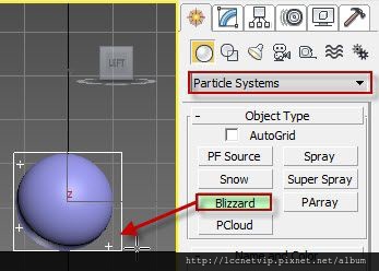 2.切換到左視圖,建立一個ParticleSyatems粒子系統-Blizzard。