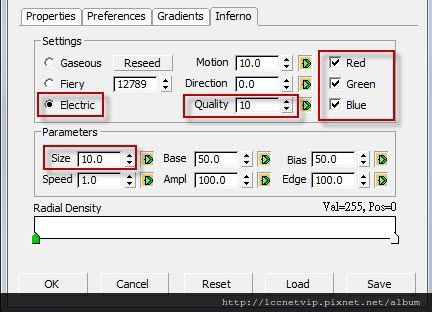 14.切換到Inferno頁籤,切換到Electric電的發光式形式,並將Red、Green、Blue選項打勾,雷電才能顯示。另外,Quality品質設定為10、Size設定雷電大小…等其他參數可以微調。