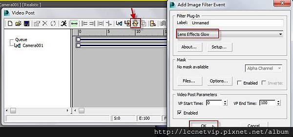 10.點擊Add Image FilterEvent,增加第一個濾鏡事件。選擇Lens Effects Glow光暈特效,使物件發光。點擊OK先確定。