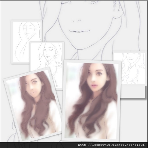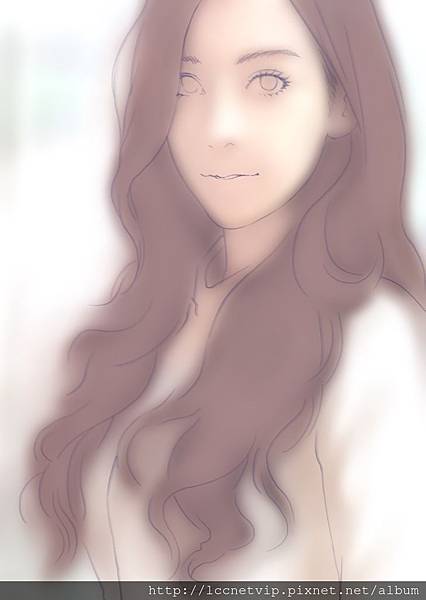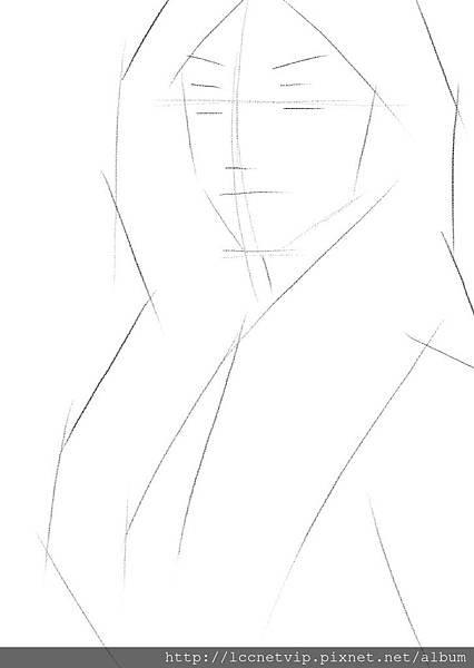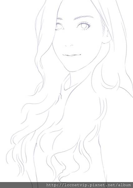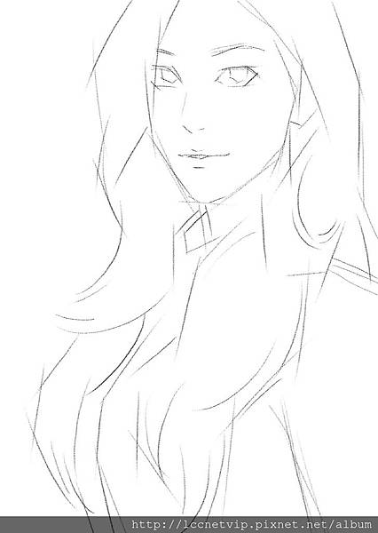 緊接著再新增一層新圖層,繼續將少女的輪廓再用更多線條,組成更具象的輪廓,此時已接近正確的形象樣子,而在畫人物時我偏好將人物視線看向鏡頭,也就是讓畫中人物看著觀賞者,因為這樣就有與觀賞者四目相交的效果,同時也有互相看著對方的感覺,不至於使畫中人物不看觀賞者,而造成不禮貌的狀況。