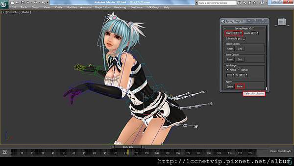 設計動作先從人型的基本架構開始,之後再來處理附加骨架的動作。使用Spring Magic的方式相當簡單,將下載好的" springmagic_07.mse "存放在非中文路徑的資料夾,再以拖曳方式甩入3DS MAX的場景中,就會出現它的操作面板了。 比較具影響效果的數值是Spring,默認值是0.3,一般而言能輕易符合大部分的需求。如果擺盪幅度過大了,可以將數值增加,數值越高擺幅越小。點擊捲展欄中Apply欄位的Bone即能輕易的套用效果。