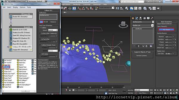 為了便於看到Particles的即時效果,可以將Display更換為Geometry,並且在Shape選擇合適的形狀。為了使熔岩噴發後能向下墜落,因此必須將Gravity添加至Force。墜落的熔岩必須在火山坡壁與地面上流動,因此必須將火山指定為UDeflector,並添加至Collision當中。