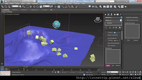 使用BlobMesh拾取PF Sorce做為Blob Objects就能實現將Particles熔接成膠狀流體的效果。為了便於看到BlobMesh產生的膠狀流體,可以將Display更換為None,使畫面乾淨。BlobMesh的Size和Tension只能影響BlobMesh拾取Blob Objects之前的外觀,Evaluaction Coarseness的Render和Viewport決定的是膠狀流體的平滑度,數值越小越平滑,在數值調整到3以下前,請先做好必須等待的心理準備。
