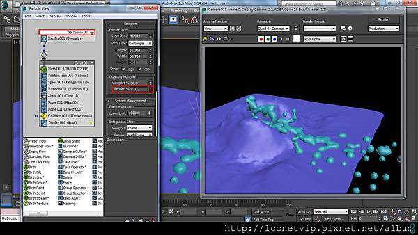 最後,要渲染出的是BlobMesh變成的膠狀流體,原先創建的PF Source所產生的Particles並沒有必要出現在畫面上,除了可以將它Hide,也可以在Particle View將Quantity Multiplier的Render %更改為0。