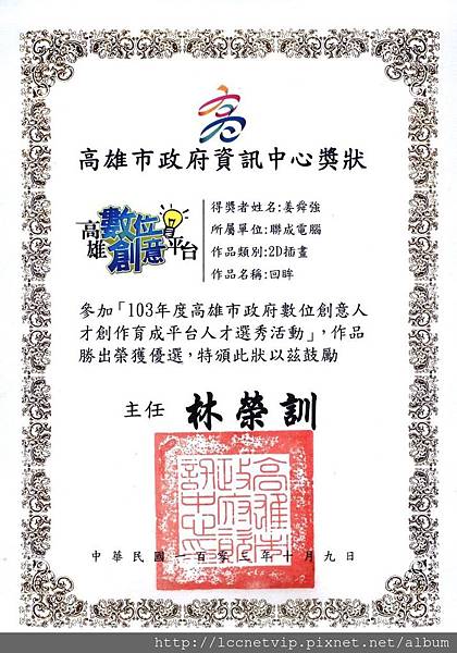 高雄市啟用數位創意人才創作育才平台以來,為文化創意持續耕耘,並於2013年廣集創作人才1,875名,收納數位創作3,492件,達成市民共同打造高雄為數位城市之目標,徹底落實數位創意人才的育成和文化創作的蓬勃。其中數創平台人才選秀活動,於投稿時間內募集作品,並進行評選優秀作品,這個具有意義的活動於今年邁入第五年,這一次高雄區域的聯成學員仍積極把握參與機會,於今年度一共有8位聯成學員表現出色榮獲優勝,7位在2D插畫領域獲獎,1位於3D插畫拿到好成績,這8位聯成學員的好表現,超越前幾年得到的佳績,競賽成績優異,為聯成電腦創下新紀錄。