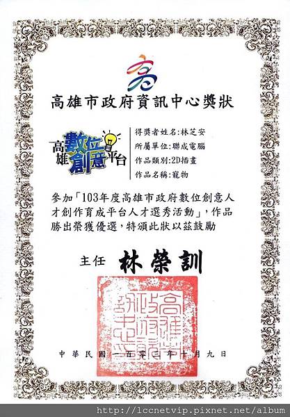 圖說:2D插畫組獎狀,獲獎學員 林芝安 。