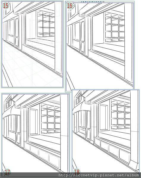 ◎利用二個消失點拉出場景的基本骨架,再依序設計出商店櫥窗和街道。