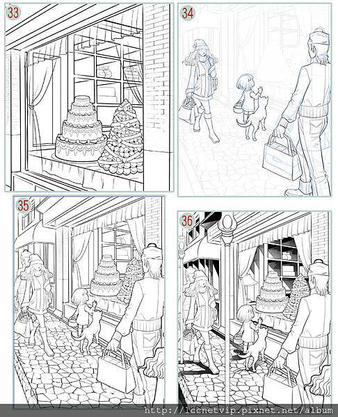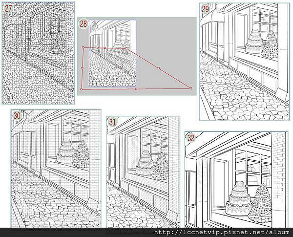 ◎主要輪廓完成後,再慢慢的去加上商店街景的細節。